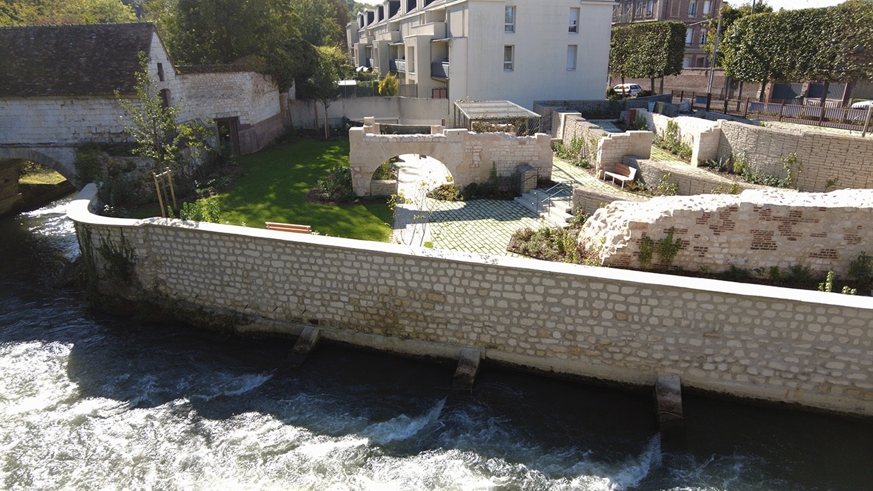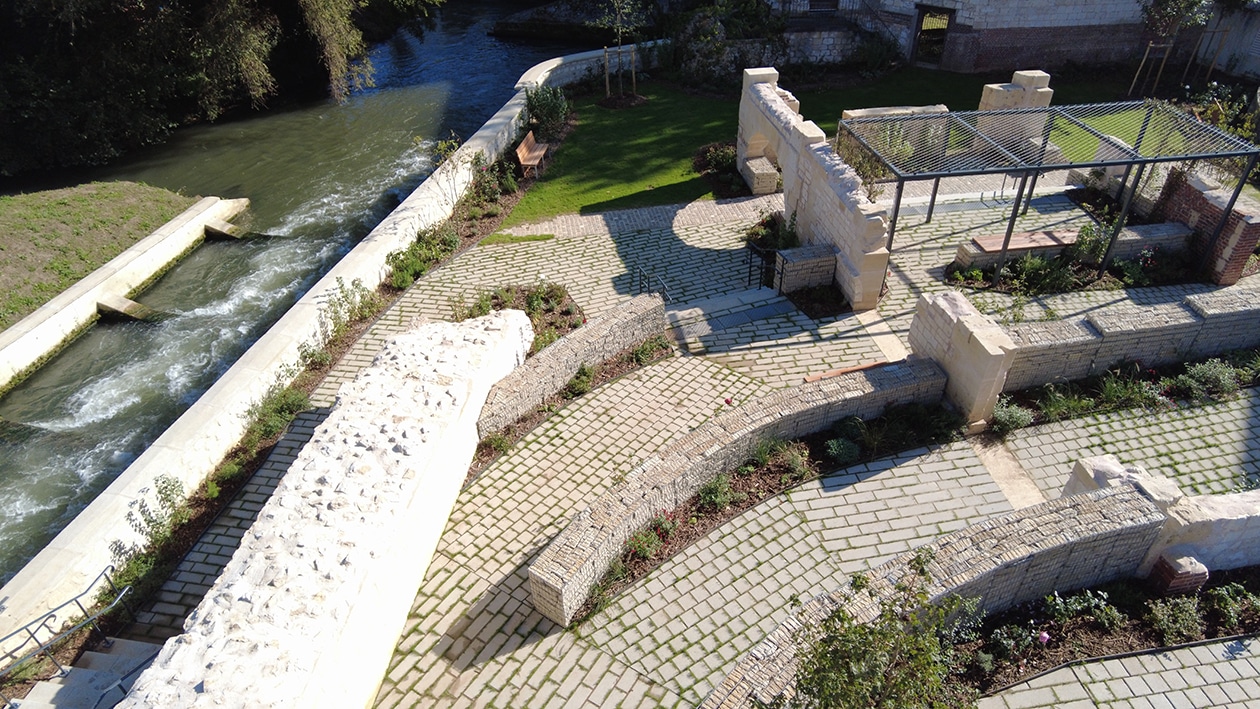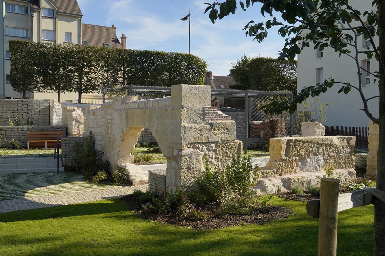 Situé sur l’ancien site de la caserne des pompiers, ce jardin de 800 m² valorise les vestiges historiques du moulin du XVIe siècle. L’arche en pierre, restaurée et mise en lumière, en devient le symbole central. Pensé par la Ville de Beauvais, ce projet allie patrimoine, nature et accessibilité.