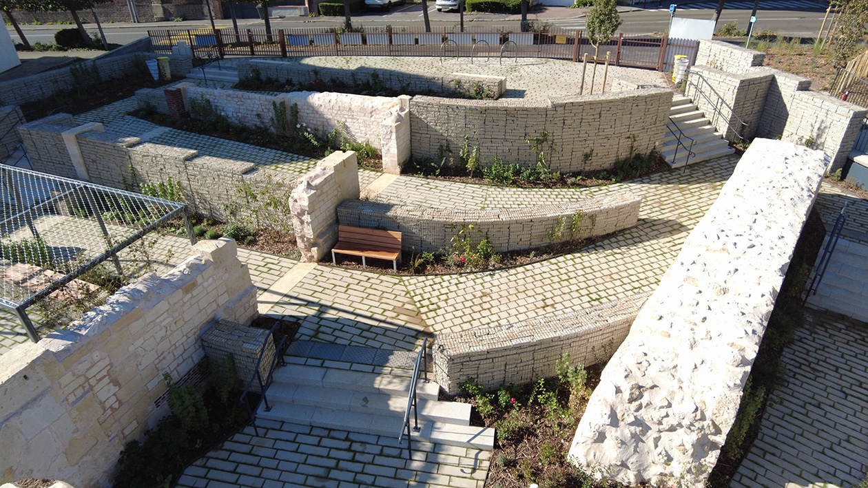 Nous sommes notamment intervenus sur la mise en place du mur en gabion, avec pierre de parement, ainsi que sur l’installation de mobilier urbain réalisé sur-mesure, notamment la pergola.